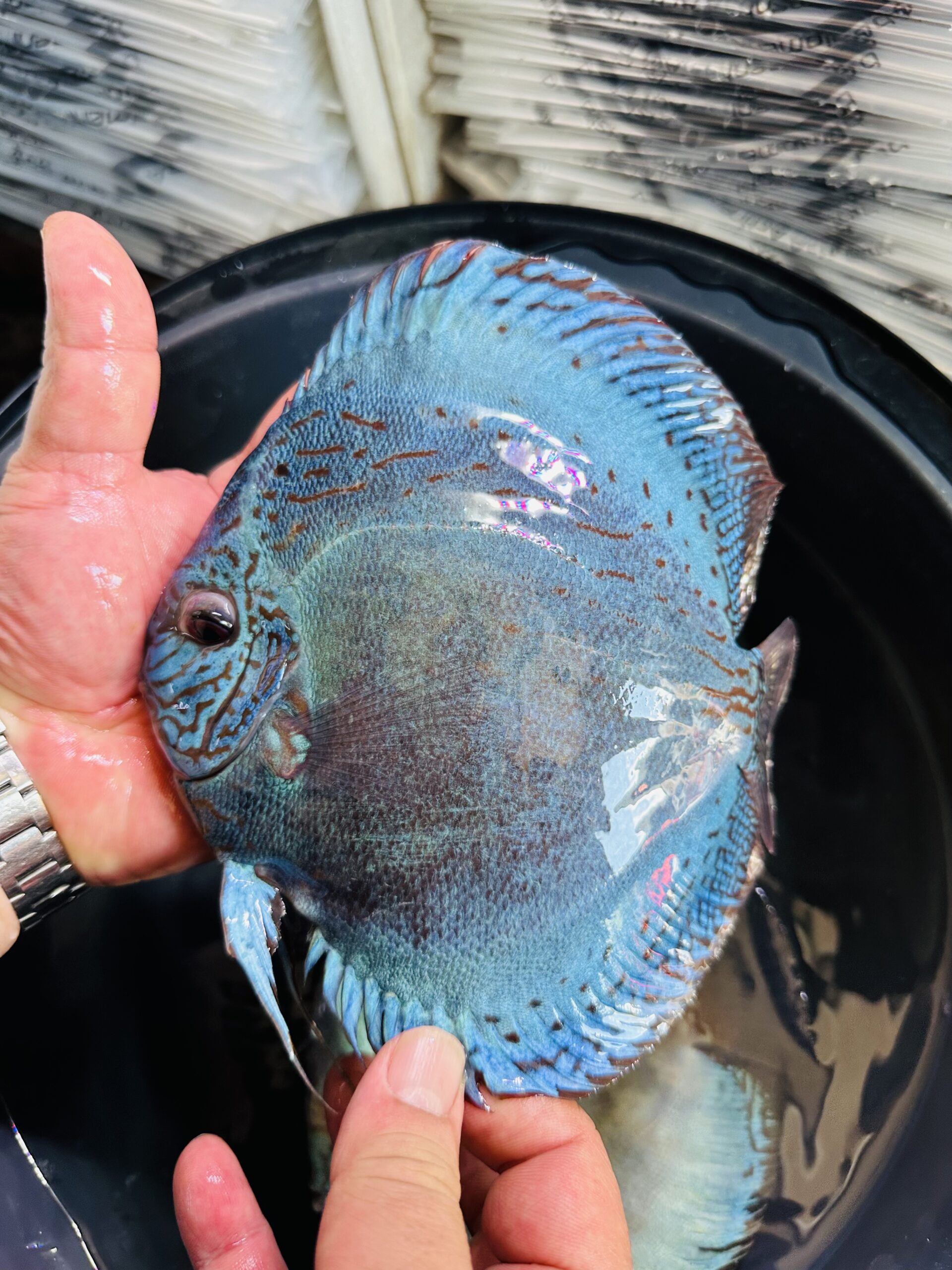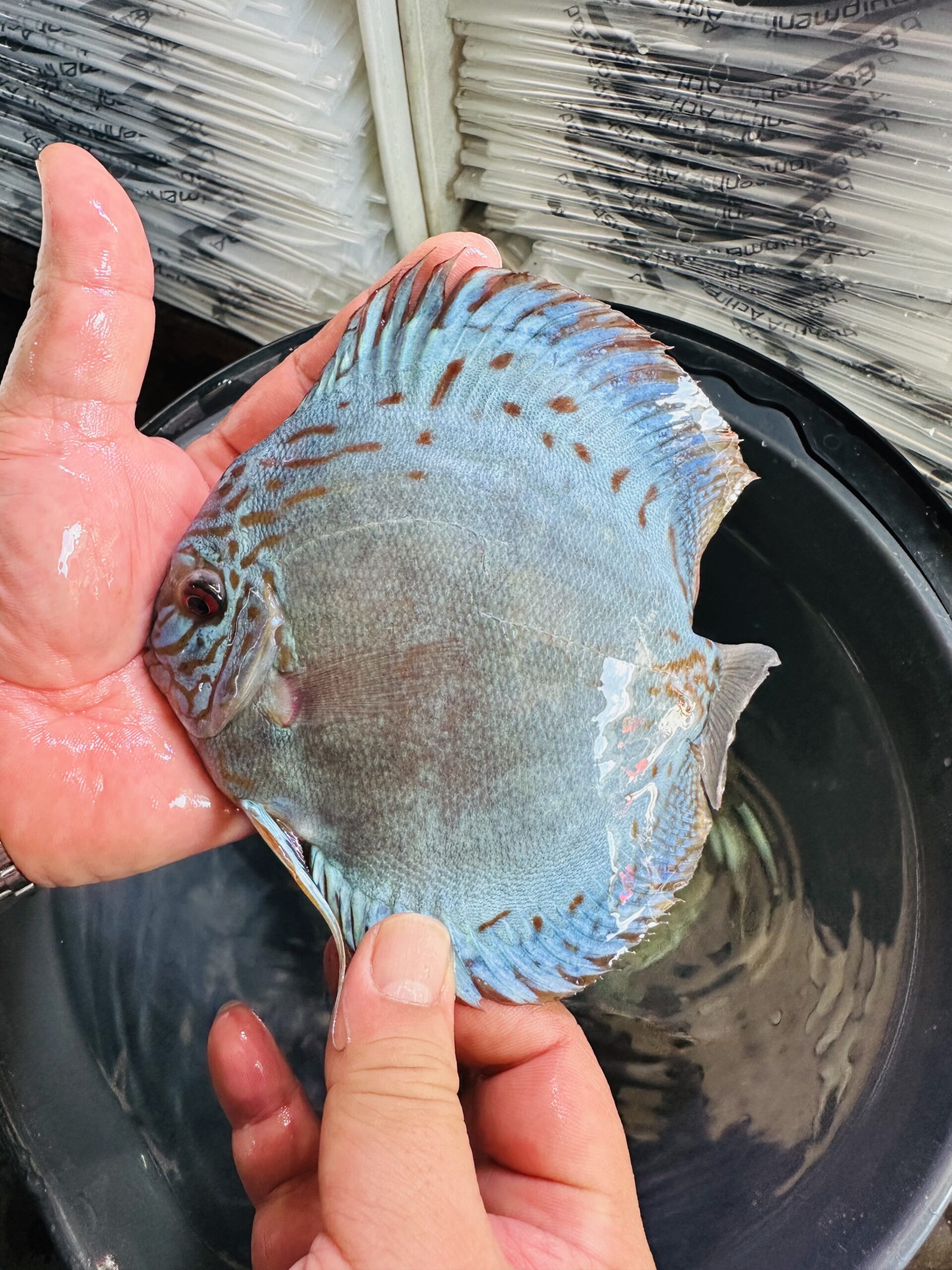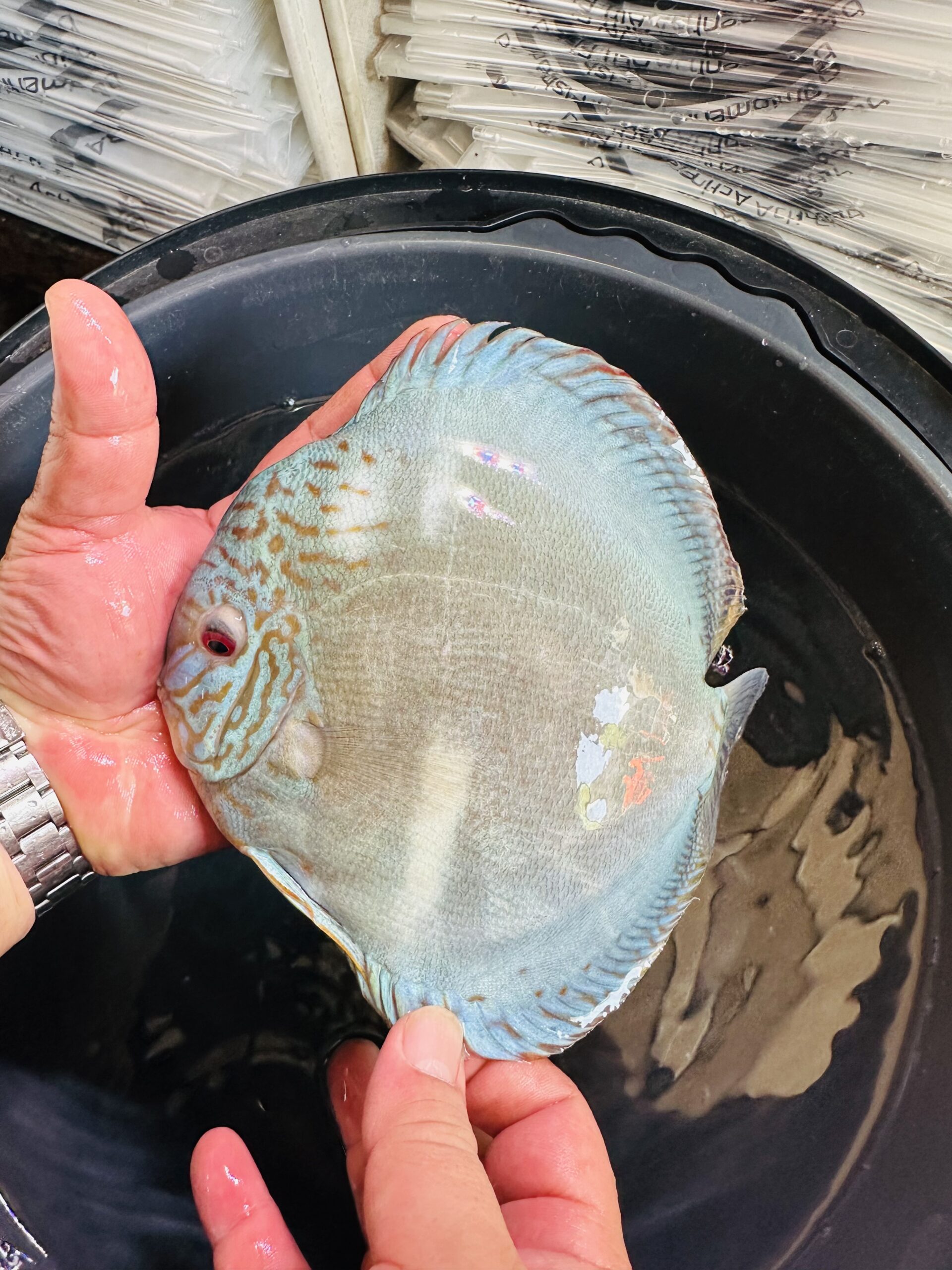 Discus fish (scientific name: Symphysodon) is a cichlid native to the Amazon Basin in South America. It’s a freshwater species with a unique shape: round and flat.